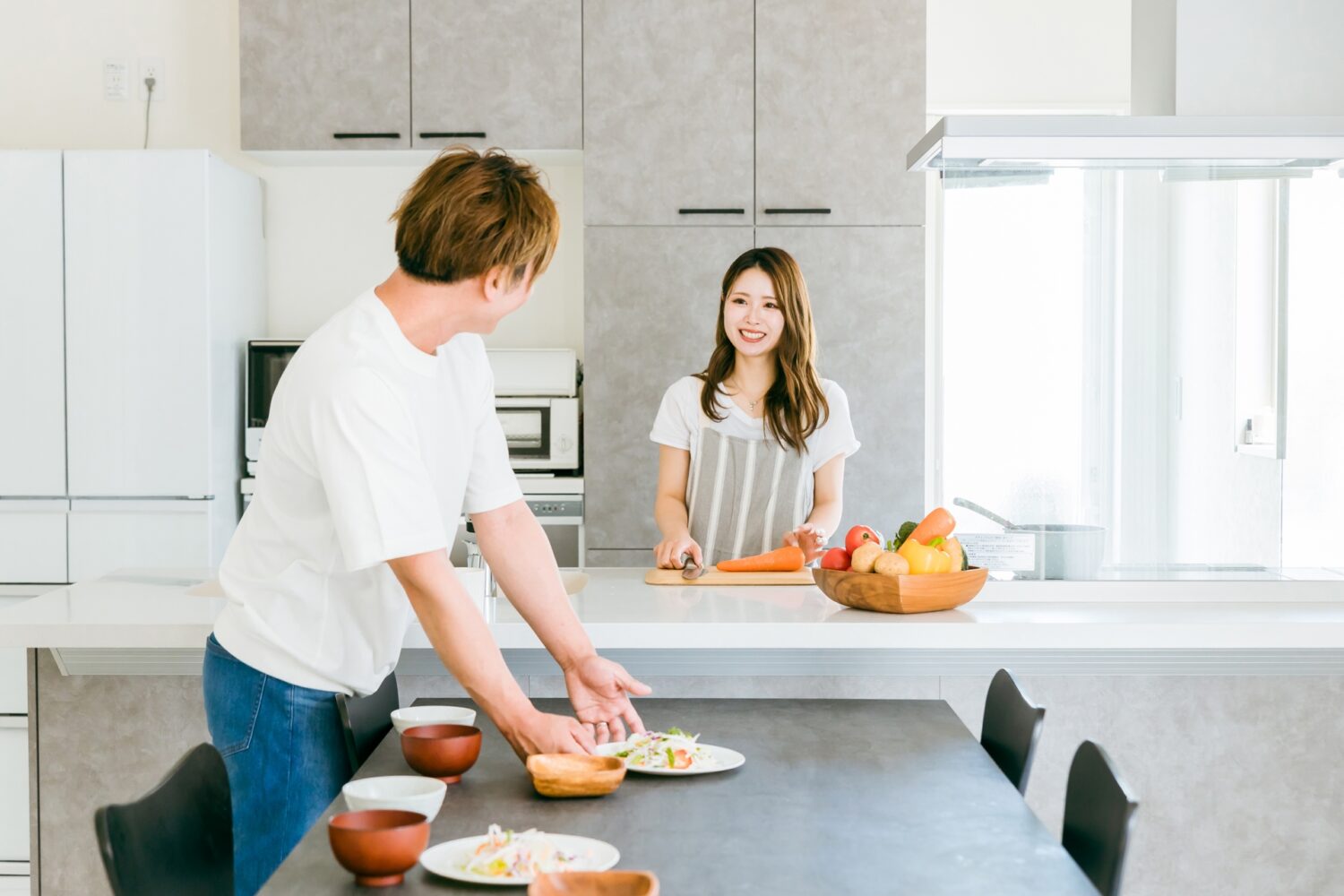 思い切ってキッチンの位置を移動。リビング・ダイニングの中央にアイランドキッチンを配置しました。キッチンに立つと、リビングもダイニングも一望でき、 料理をしながら家族と会話を楽しめる開放的な空間に。キッチンの向こう側から家族が配膳の手伝いなどもでき、スマートな家事が実現できます。