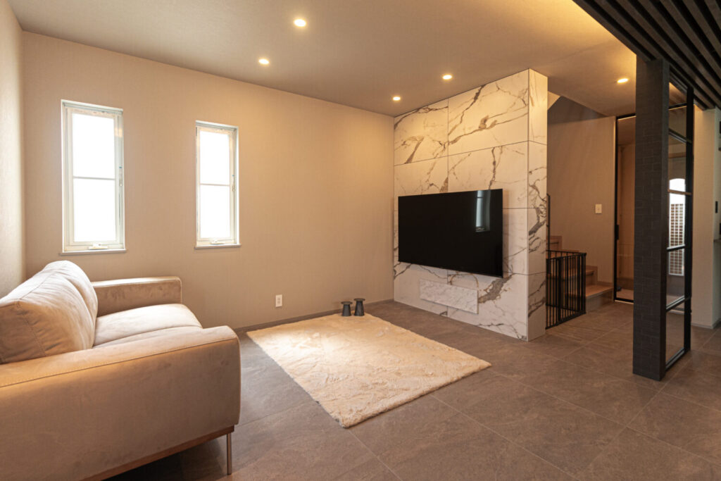 造作テレビボードは、壁の幅や高さに合わせて設計できるため、空間にぴったり収めることができます。そのため。リビングをすっきりとした空間にすることができます。