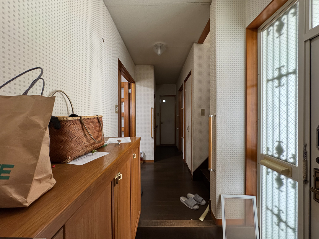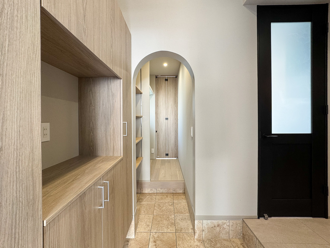玄関には収納棚とその奥にハンガーポールを作りました。帰宅後、ここを通って上着などをかければ、「リビングに置きっぱなし」を防ぐことができます。部屋を散らかさない、流れの中で片付けができる動線づくり。見た目だけではない、暮らしをブラッシュアップさせるリノベーションアイディアです。