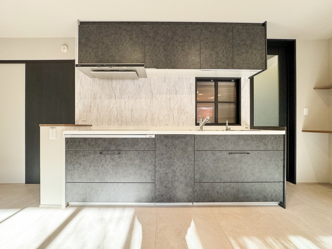 キッチンは柔らな色味でまとめたなかに、アクセントになるシックな色合いを採用しました。