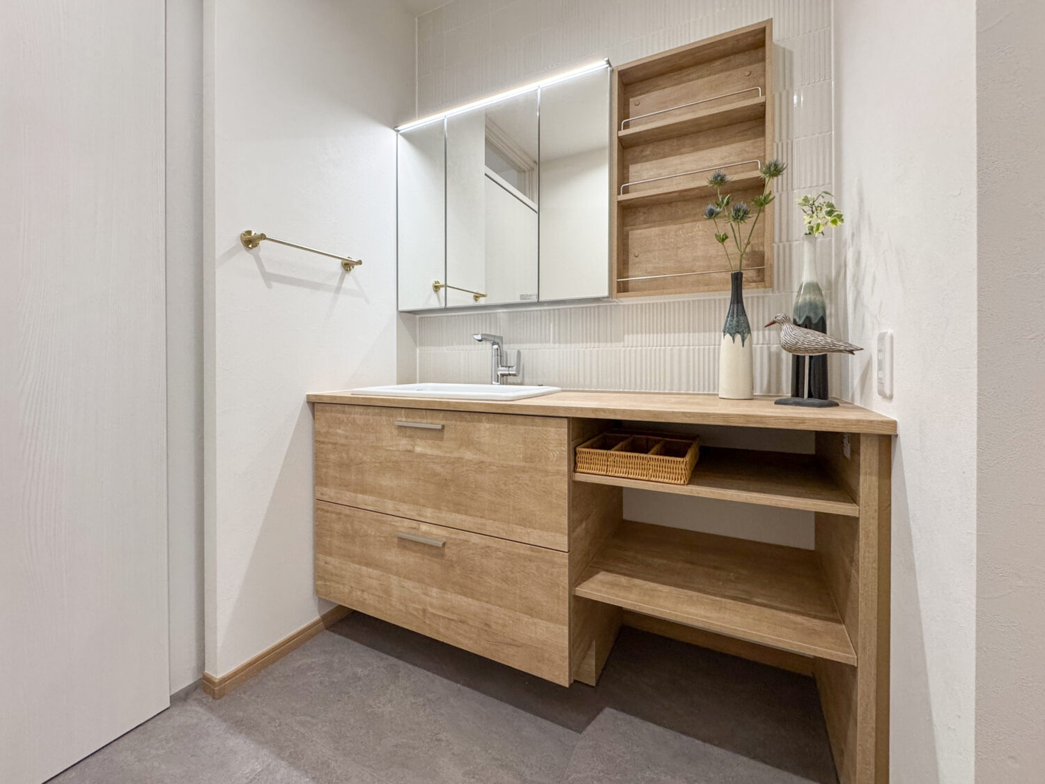 洗面台はシンプルにまとめながらも、背面のタイルやゴールドのタオルハンガーが可愛らしくやさしい雰囲気を演出しています。