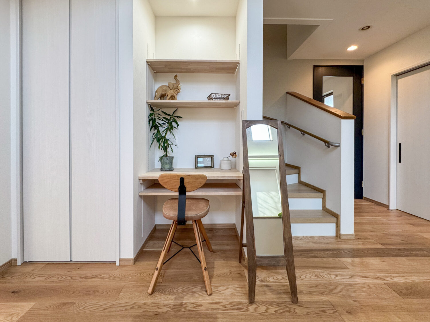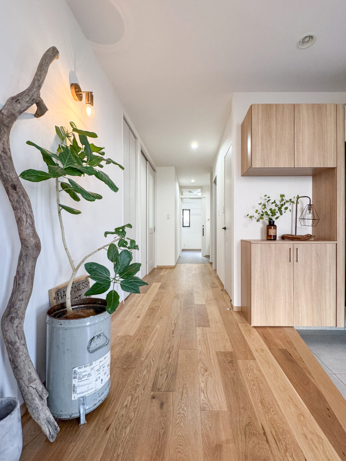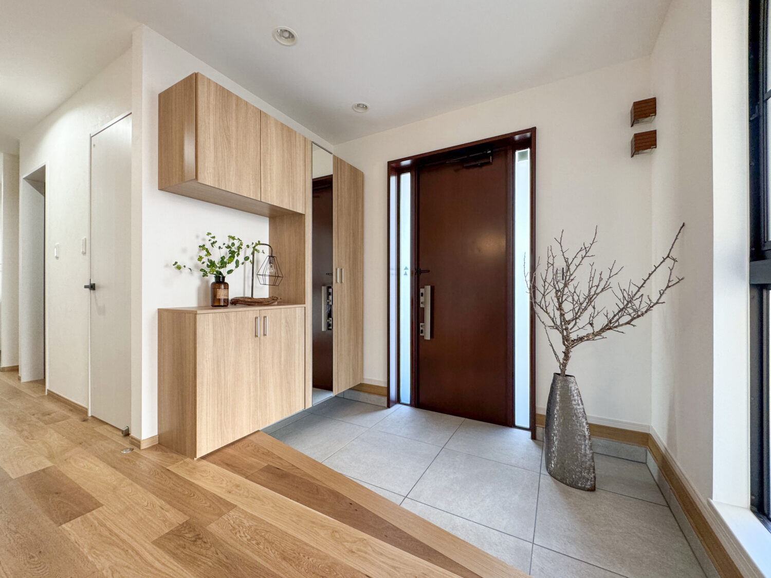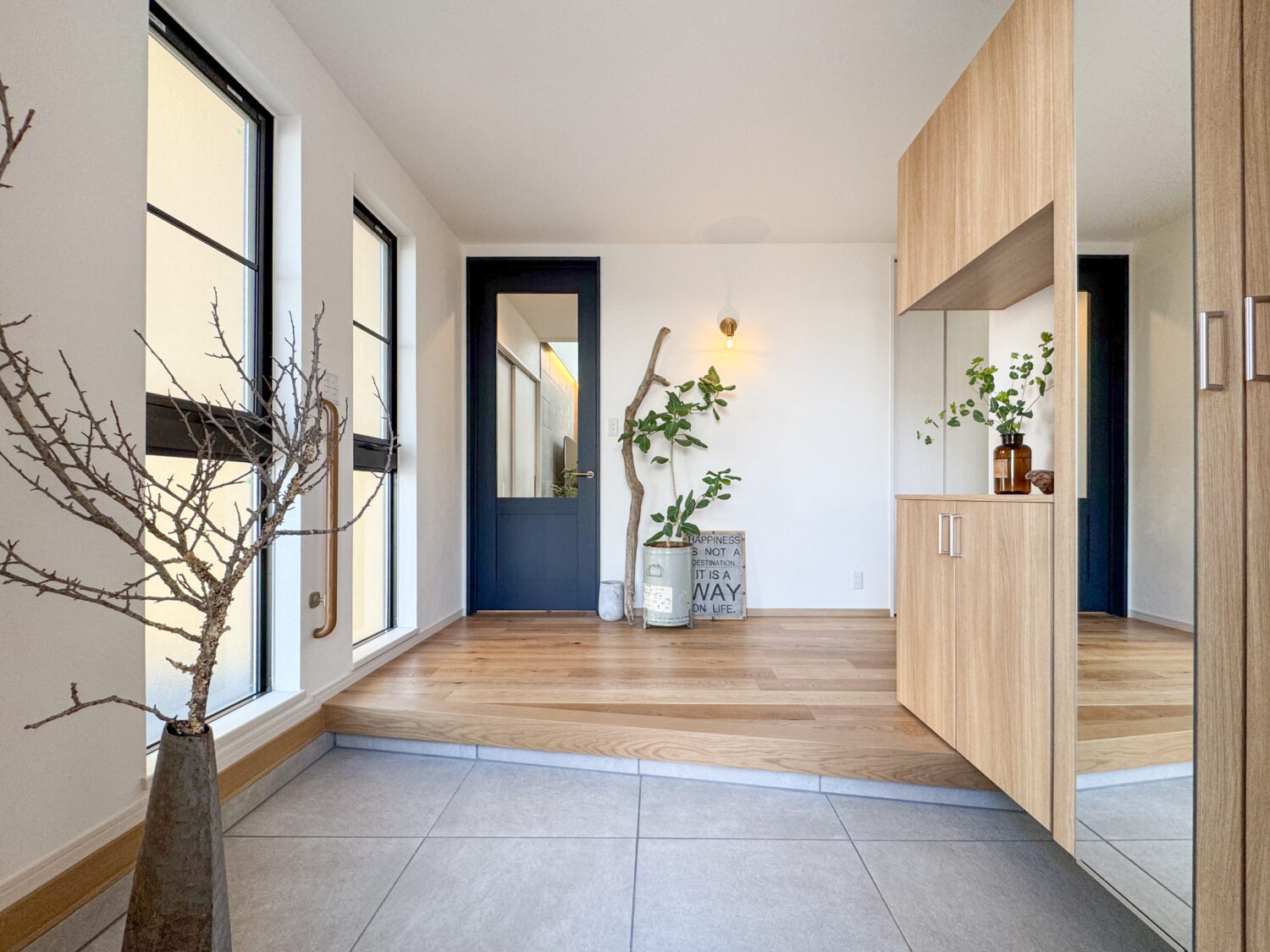 玄関入ってすぐに見えるリビングドアをネイビーにし、白と木目を基調とした玄関の印象をぐっと引き締めました。 大きく間取りを変えなくても、住まいの印象や暮らしやすさは大きく変わります。