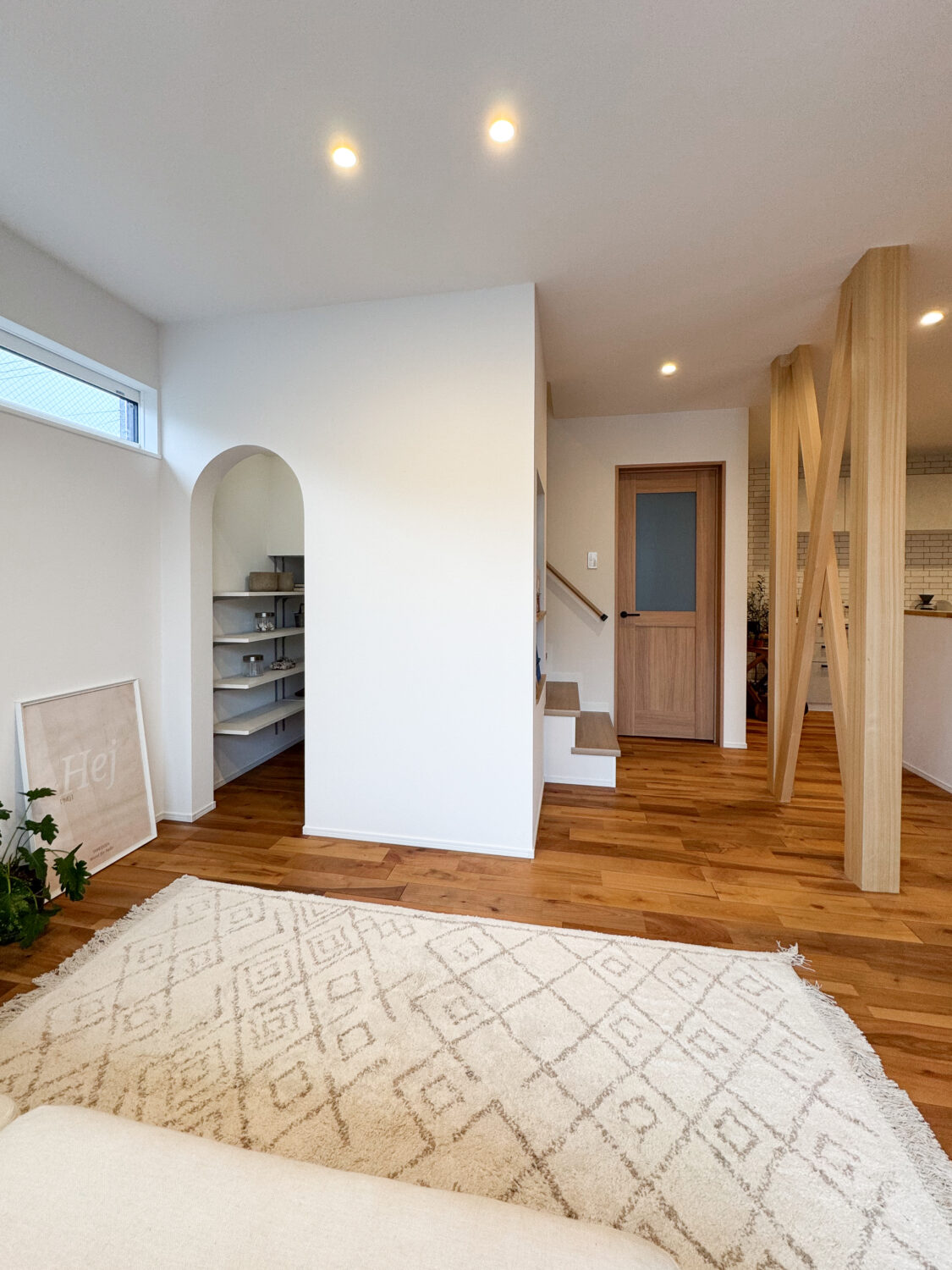 玄関横にあった急な階段は、リビングのなかへ移動し、緩やかな階段へ。